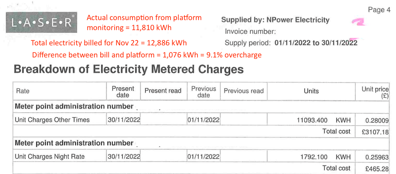 On this basis, it appears that the school has consistently been overcharged about 9.1% of their total electricity consumption, amounting to 934 kWh in May and 1,076 kWh in November. That amounts to a potential overcharge amount on their electricity consumption worth about £151 in May and £298 in November (due to a rate increase from October 2022).